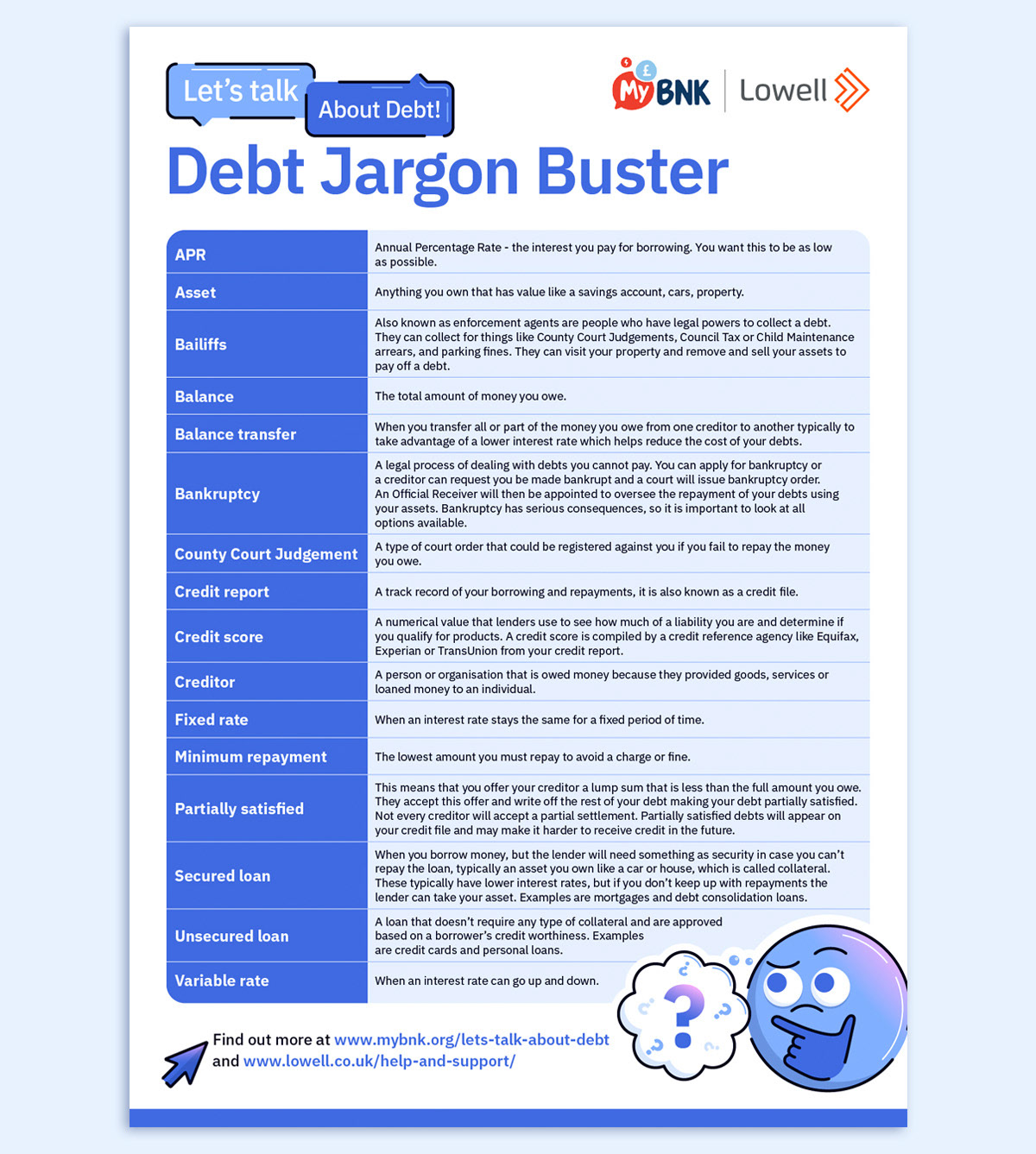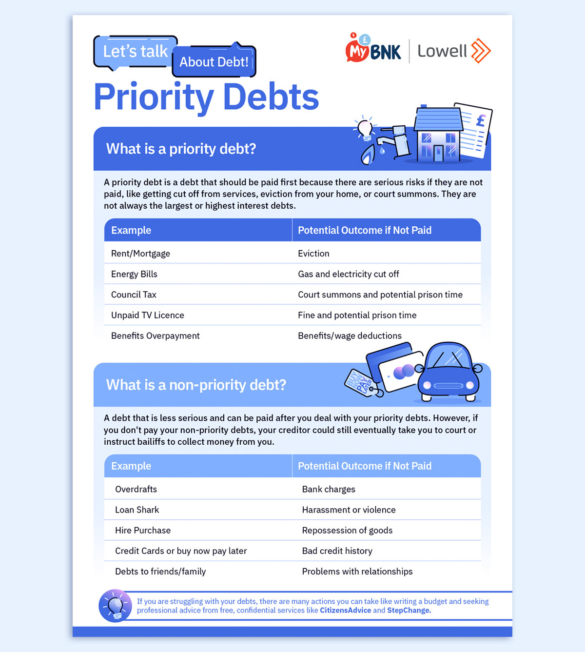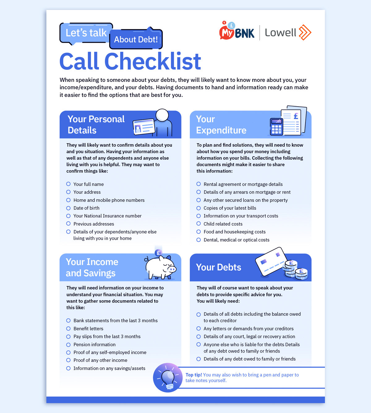 Suite of three money advice handout sheets with custom icons and graphics