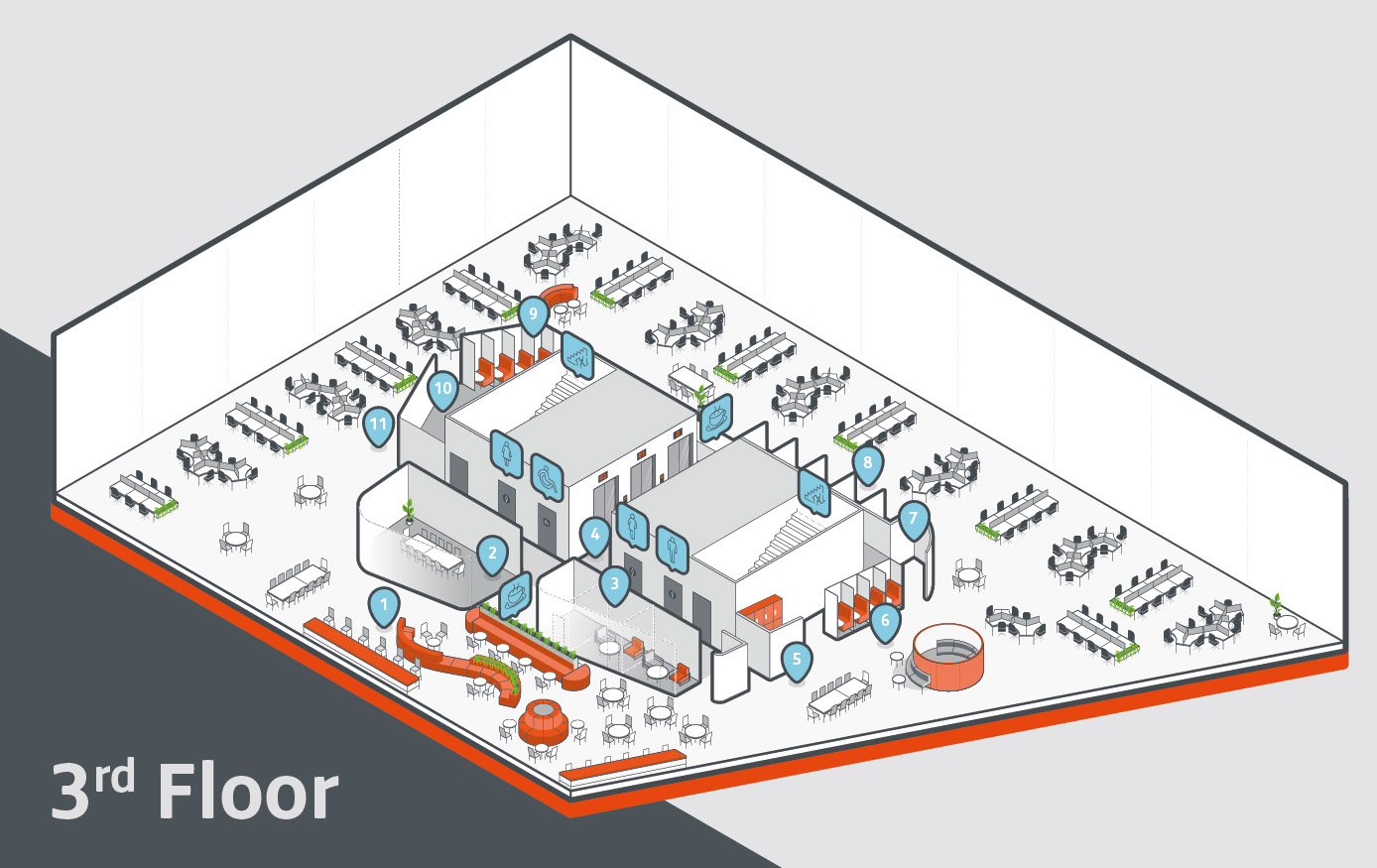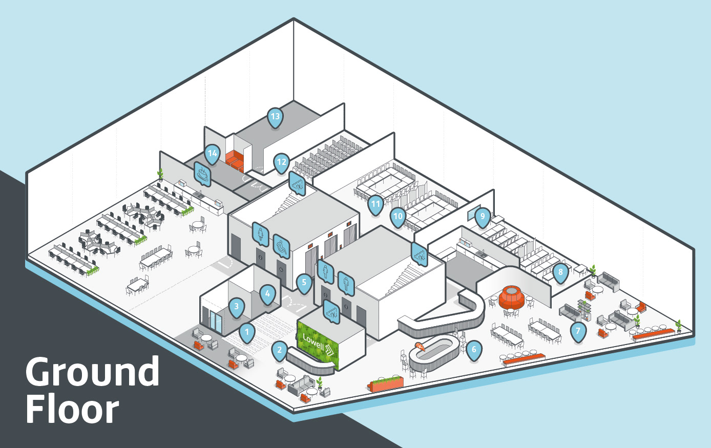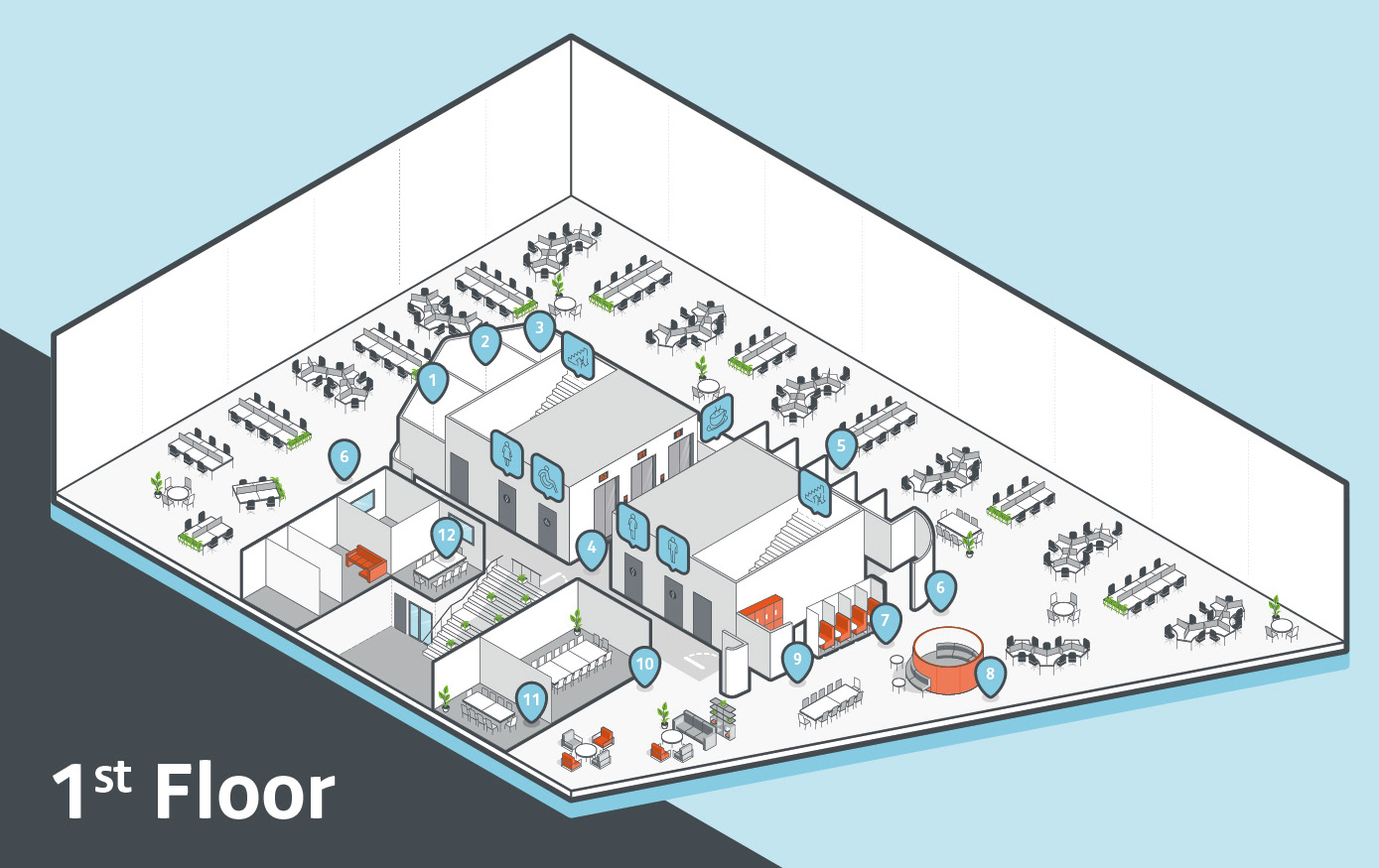 Seven bespoke detailed isometric floor plan illustrations to indicate facilities on each floor