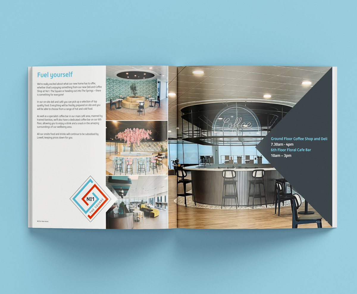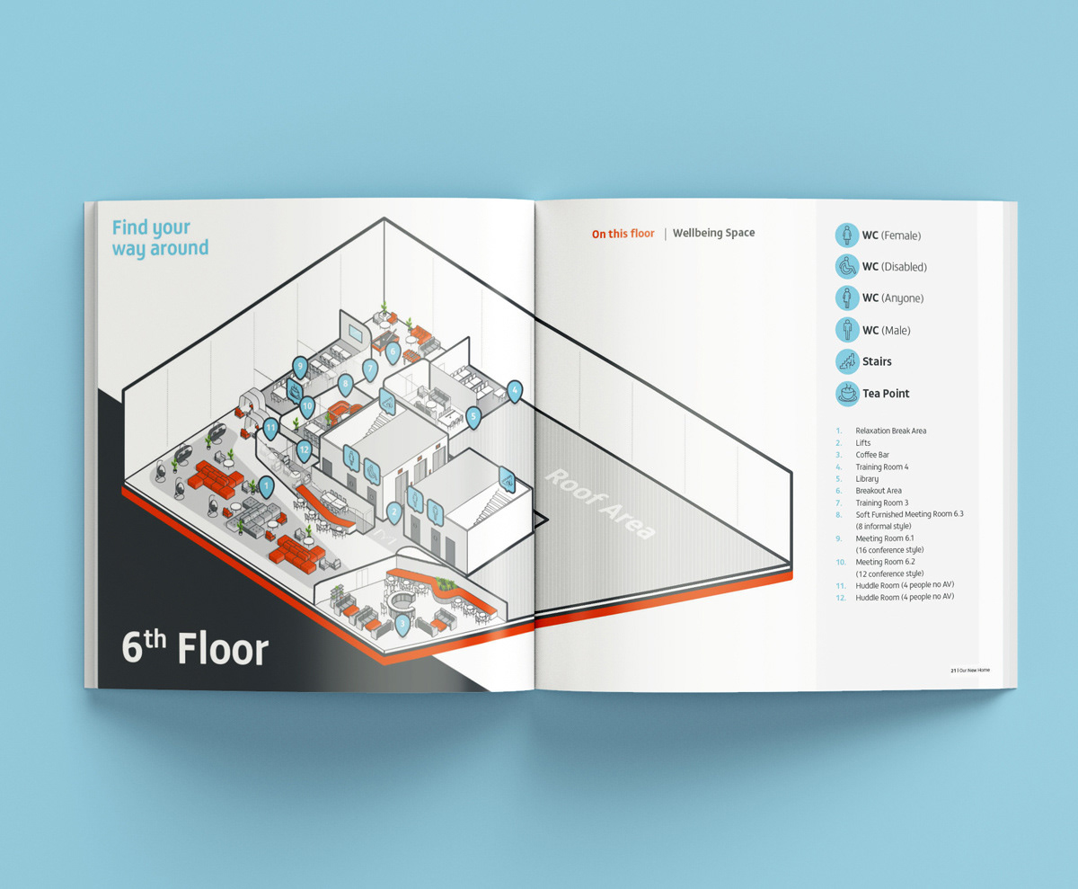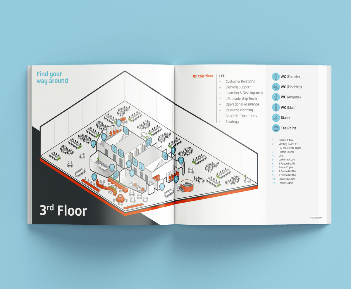 Square booklet for employees so they can navigate the new office building